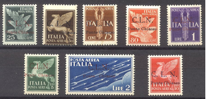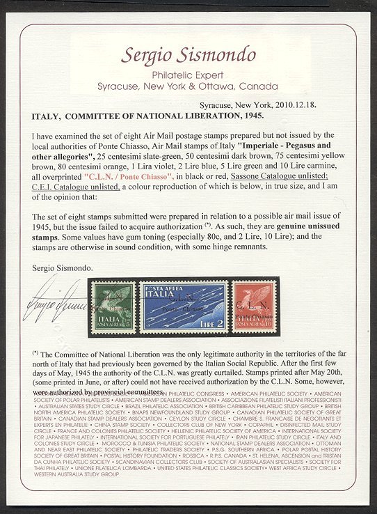 Scott # Unl.: 1945 CLN / Ponte Chiasso Ovpts Centering & Condition: Mint. Fresh. Fine-Very Fine set. A Sismondo Certificate accompanies. Reverse (Gum Side): Original gum. Hinged with a single, neat remnant on each. Faults / Imperfections: None The item pictured is the actual item you are purchasing, unless otherwise noted. I also offer an interest-free layaway plan. Ask me about it!" All items will be mailed a day or two after payment is received. -------------------------------------------------------------------------------- Please click any of the following to read: |