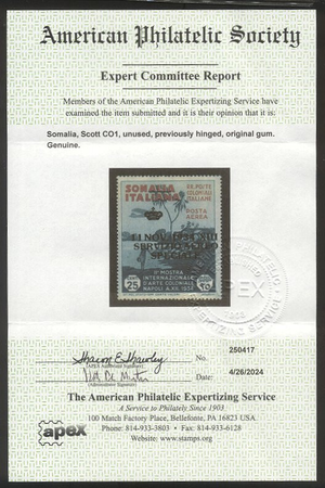 Scott #CO1: 1934 25c Colonial Arts Expo w/ Ovpt Centering & Condition: Mint. Fresh. Very Fine and RARE. An APEX certificate Reverse (Gum Side): Original gum. Lightly Hinged. Faults / Imperfections: None The item pictured is the actual item you are purchasing, unless otherwise noted. I also offer an interest-free layaway plan. Ask me about it!" All items will be mailed a day or two after payment is received. --------------------------------------------------------------------------------