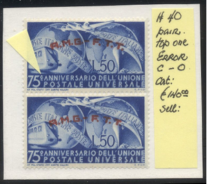Scott #40: 1949 50 l UPU w/ "Broken O" Centering & Condition: Mint. Fresh. Very Fine Pair with the top stamp showing the variety. Reverse (Gum Side): Original gum. Hinged. Faults / Imperfections: None The item pictured is the actual item you are purchasing, unless otherwise noted. I also offer an interest-free layaway plan. Ask me about it!" All items will be mailed a day or two after payment is received. --------------------------------------------------------------------------------
