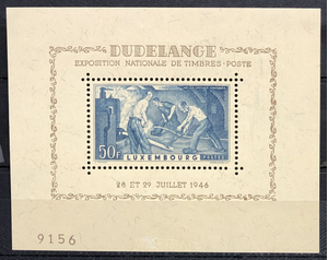 Old Rolling Mill, National Postage Stamp Exhibition, Dudelange, 1946. Souvenir sheet.