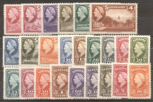 Scott #184-207: 1945 Queen Wilhelmina Set Centering & Condition: Mint. Fresh. Very Fine set. Reverse (Gum Side): Original gum. Lightly Hinged. Faults / Imperfections: None The item pictured is the actual item you are purchasing, unless otherwise noted. I also offer an interest-free layaway plan. Ask me about it!" All items will be mailed a day or two after payment is received. --------------------------------------------------------------------------------