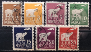 Polar bear and airplane, 1925. Issued to help finance, Roald Amundsen's attempted flight to the North Pole. Complete set of 7.
