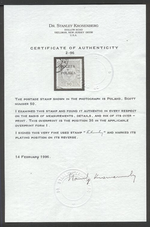 Scott #50: 1919 90h Red Violet Centering & Condition: Used. Very Fine and SCARCE. Accompanied by a certificate from Dr. Kronenberg plus it is signed. Not many of these exist as genuine and certified as such. Reverse (Gum Side): N/A Faults / Imperfections: None The item pictured is the actual item you are purchasing, unless otherwise noted. I also offer an interest-free layaway plan. Ask me about it!" All items purchased will be mailed a day or two after payment is received. --------------------------------------------------------------------------------