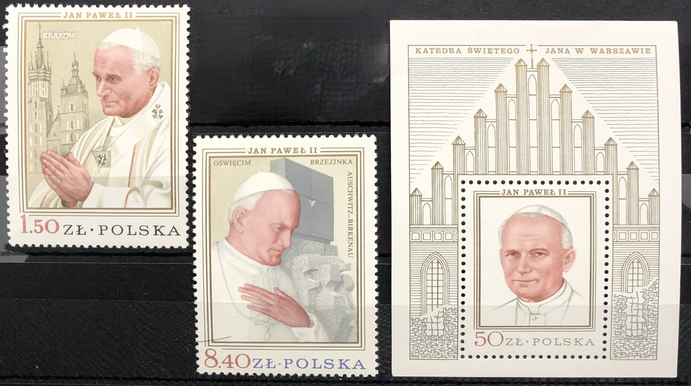 Visit of Pope John Paul II to Poland, 1979. Complete set of 3 plus souvenir sheet.