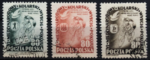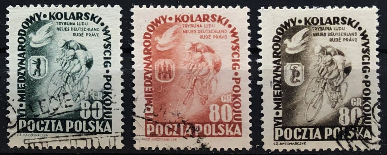 Cyclists and arms of Warsaw, 1953. 6th International Peace Bicycle Race, Warsaw-Berlin-Prague, 1953. Complete set of 3.