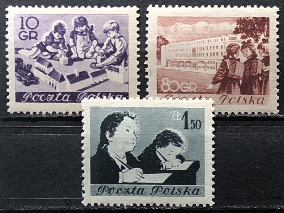 Children at play, girls on the way to school, two students in class, 1953. Complete set of 3.