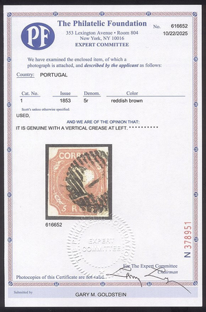 Scott #1: 1853 5r Red Brown Centering & Condition: Used. Fine and SCARCE with margins all around. A Foundation certificate accompanies. Reverse (Gum Side): N/A Faults / Imperfections: Very light crease The item pictured is the actual item you are purchasing, unless otherwise noted. I also offer an interest-free layaway plan. Ask me about it!" All items purchased will be mailed a day or two after payment is received. --------------------------------------------------------------------------------