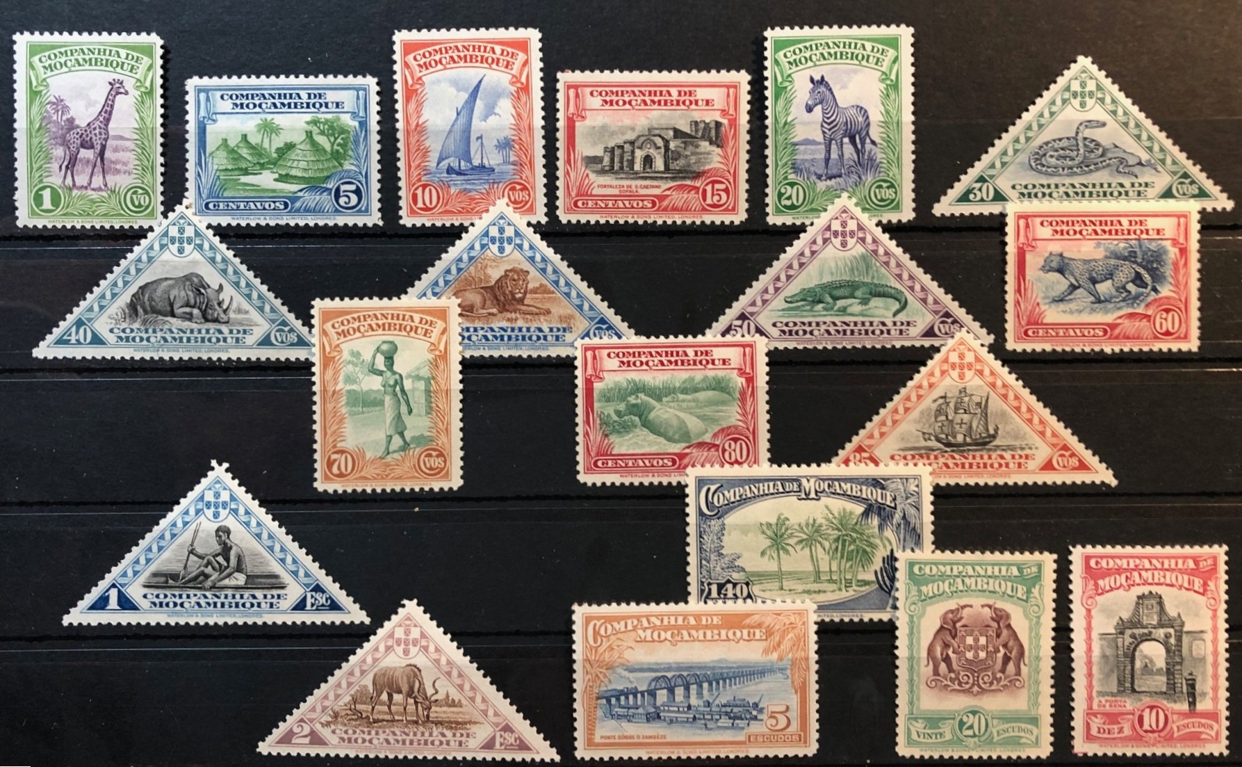 Giraffe, Thatched Huts, Rock Python, Coconut Palms, Zambezi Railroad Bridge, Sena Gate, Company Arms, Dhow, St. Caetano Fortress, Sofala, Zebra, Black Rhinoceros, Lion, Crocodile Leopard, Mozambique Woman, Hippopotami, Vasco da Gama's flagship, Man in canoe, Greater kudu, 1937. Complete set of 19.