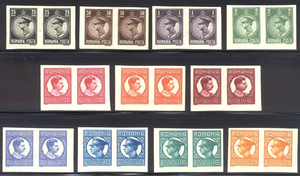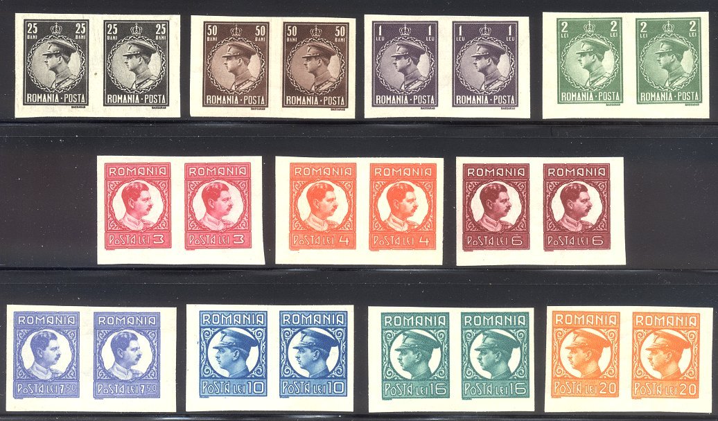 Scott #369-79: 1930 King Carol, Imperf Set Centering & Condition: Mint. Fresh. Very Fine set of Imperf Pairs. Reverse (Gum Side): Original Gum. Never Hinged. Faults / Imperfections: None The item pictured is the actual item you are purchasing, unless otherwise noted. I also offer an interest-free layaway plan. Ask me about it!" All items will be mailed a day or two after payment is received. -------------------------------------------------------------------------------- Please click any of the following to read: |