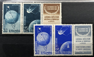 Sputnik 1 and Earth, Sputnik 1 and 2 circling globe, 1957. 2 pairs with labels.