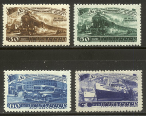 Scott #1261-64: 1948 Transportation Set Centering & Condition: Mint. Fresh. Very Fine set. Reverse (Gum Side): Original gum. Lightly Hinged. Faults / Imperfections: None The item pictured is the actual item you are purchasing, unless otherwise noted. I also offer an interest-free layaway plan. Ask me about it!" All items will be mailed a day or two after payment is received. --------------------------------------------------------------------------------