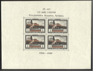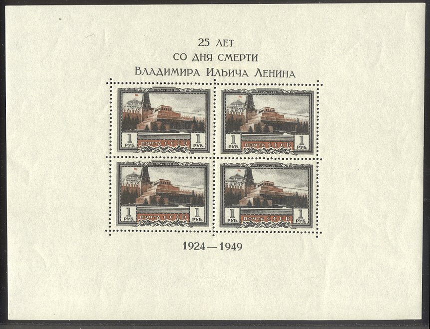 Scott #1327: 1949 Lenin Mausoleum S/S Centering & Condition: Mint. Fresh. Very Fine sheet. Reverse (Gum Side): Original gum. Hinged. Faults / Imperfections: None The item pictured is the actual item you are purchasing, unless otherwise noted. I also offer an interest-free layaway plan. Ask me about it!" All items will be mailed a day or two after payment is received. --------------------------------------------------------------------------------