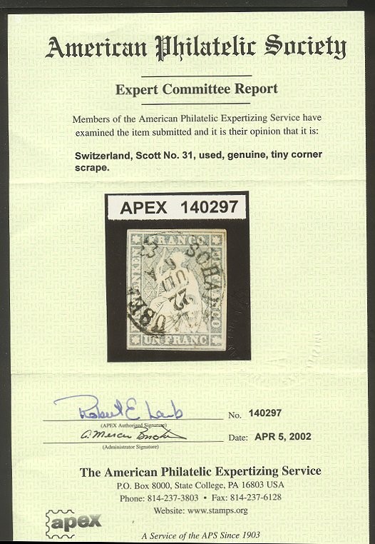 Scott #31: 397100516246 Centering & Condition: Used. Good color. Fine. A certificate accompanies. Reverse (Gum Side): N/A. Faults / Imperfections: Tiny abrasion lower right The item pictured is the actual item you are purchasing, unless otherwise noted. I also offer an interest-free layaway plan. Ask me about it!" All items purchased will be mailed a day or two after payment is received. --------------------------------------------------------------------------------