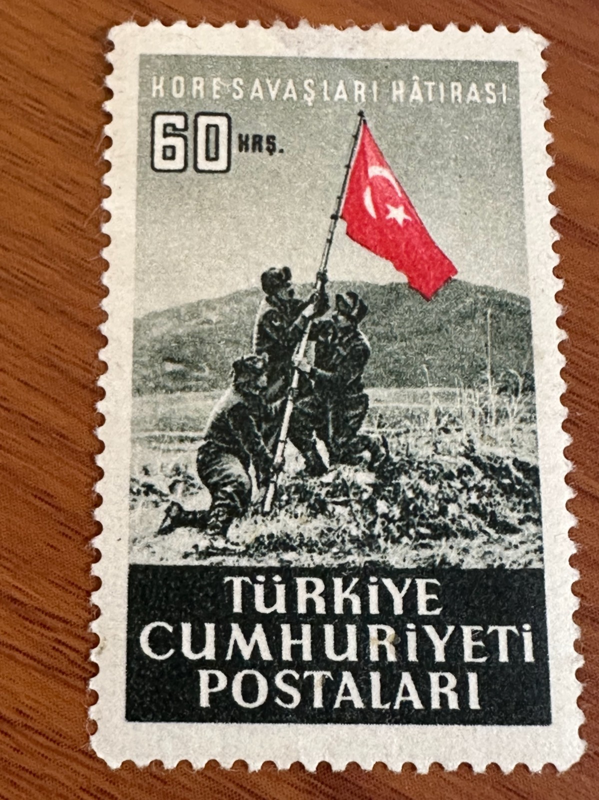1952 Turkish postage stamp featuring Turkish soldiers in South Korea. This stamp is graded as VF (Very Fine) and is in Mint Never Hinged quality,.