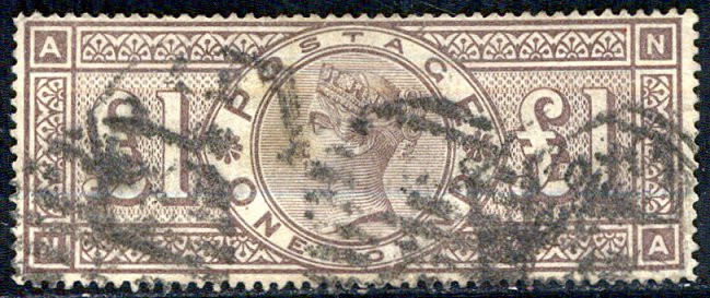 Scott #110: 1884 £1 Brown Violets Centering & Condition: Used. Fine and SCARCE. Reverse (Gum Side): N/A Faults / Imperfections: None The item pictured is the actual item you are purchasing, unless otherwise noted. I also offer an interest-free layaway plan. Ask me about it!" All items will be mailed a day or two after payment is received. ![]() ![]() ![]() --------------------------------------------------------------------------------