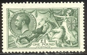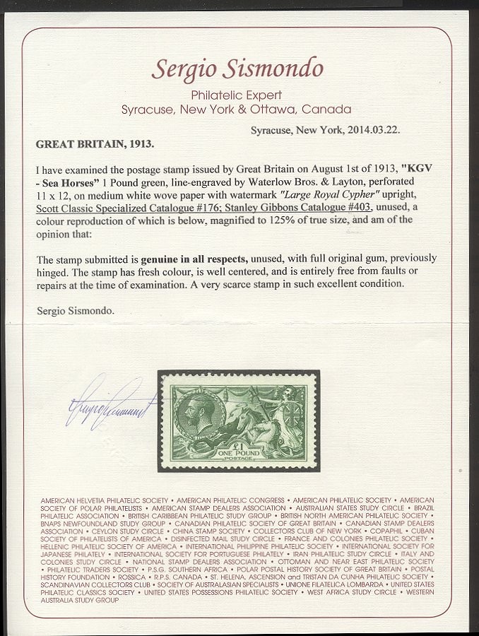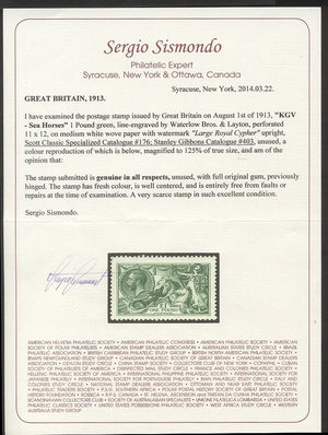 Scott #176: 1913 £1 Green, Seahorse Centering & Condition: Mint. Fresh. Very Fine and SCARCE. A Sismondo certificate accompanies. Reverse (Gum Side): Original gum. Hinged. Minor gum bend. Faults / Imperfections: None The item pictured is the actual item you are purchasing, unless otherwise noted. I also offer an interest-free layaway plan. Ask me about it!" All items will be mailed a day or two after payment is received. --------------------------------------------------------------------------------