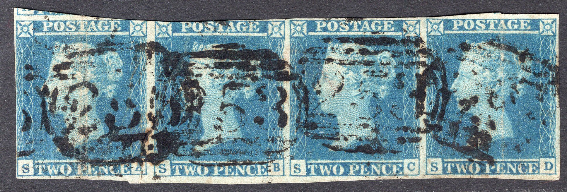 Great Britain Scott 4. Strip of 3. Used. Very very trivial thin. 47