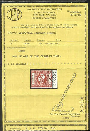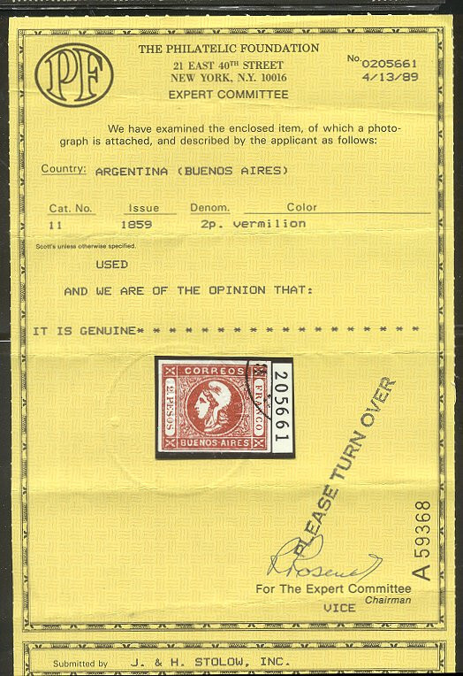 Scott #11: 1959 2p Vermilion Centering & Condition: Used. Rich color. Very Fine. A Foundation certificate accompanies. Reverse (Gum Side): N/A Faults / Imperfections: None The item pictured is the actual item you are purchasing, unless otherwise noted. I also offer an interest-free layaway plan. Ask me about it!" All items purchased will be mailed a day or two after payment is received. --------------------------------------------------------------------------------