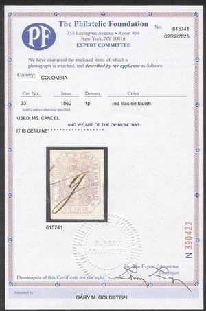 Scott #23: 1862 1p Red Lilac on Bluish Centering & Condition: Used. Very Fine and SCARCE. A Foundation certificate accompanies. Reverse (Gum Side): N/A Faults / Imperfections: None The item pictured is the actual item you are purchasing, unless otherwise noted. I also offer an interest-free layaway plan. Ask me about it!" All items purchased will be mailed a day or two after payment is received. --------------------------------------------------------------------------------