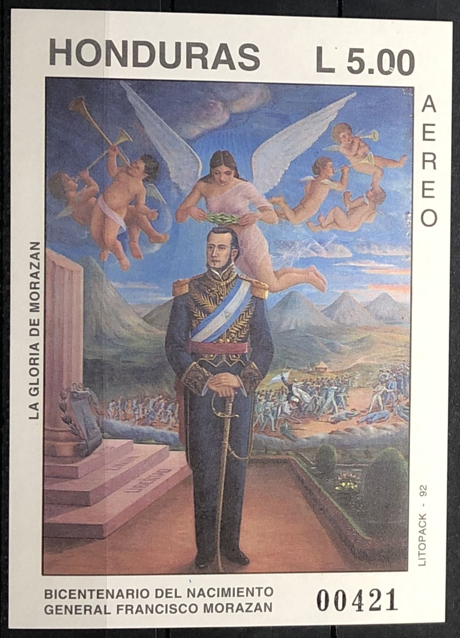 Portrait of Morazan, 1992. Souvenir sheet.