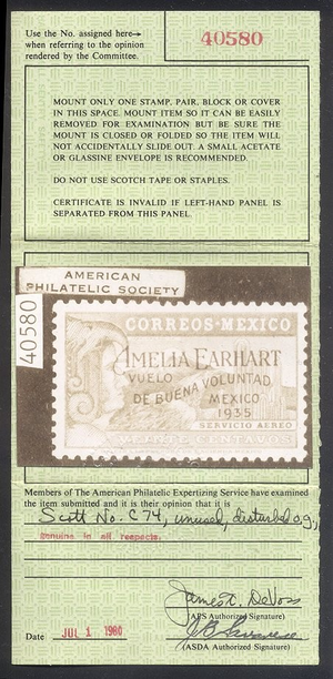 Scott #C74: 1935 10c Earhart Ovpt Centering & Condition: Mint. Fresh. Very Fine. As nice an example of this stamp Reverse (Gum Side): Original gum (the gum is NOT disturbed as the certificate Faults / Imperfections: None The item pictured is the actual item you are purchasing, unless otherwise noted. I also offer an interest-free layaway plan. Ask me about it!" All items will be mailed a day or two after payment is received. --------------------------------------------------------------------------------