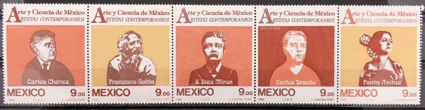 Contemporary Artists, 1983. Strip of 5. Folded between 2nd and 3rd stamps.