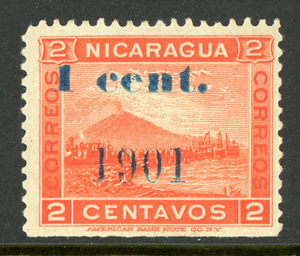 Nicaragua 1901 Momotombo 1¢ on 2¢ (Blue OP) Maxwell # 196R Mint W33