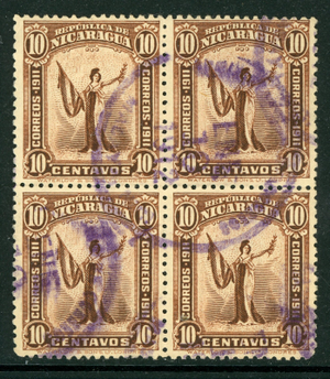 Nicaragua 1911 Liberty 10¢ Red Brown Scott #301 VFFU Block Q331