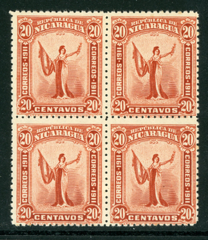 Nicaragua 1912 Liberty 20¢ Red Sc 303 Block of 4 Mint Q338