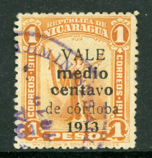 Nicaragua 1913 Gold Liberty ½¢/1 Peso Black Overprint Sc 313 VFU Q508