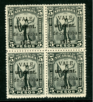 Nicaragua 1913 Liberty Gold Currency 1¢ /5 Peso Sc 317 Block Mint Q514