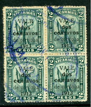 Nicaragua 1913 Liberty Gold Currency 2¢/2P Blue Green Sc 323 Block VFU W959