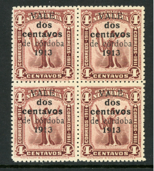 Nicaragua 1913 Liberty Gold Currency 2¢/4¢ Brown Violet Sc 318 Block Mint Q529