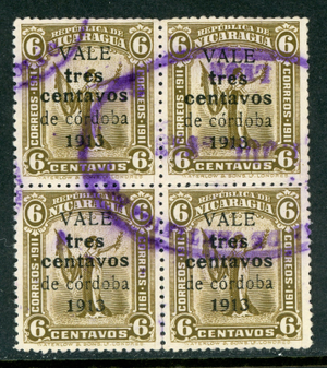 Nicaragua 1913 Liberty Gold Currency 3¢/6¢ Olive Sc 324 Block VFU W960