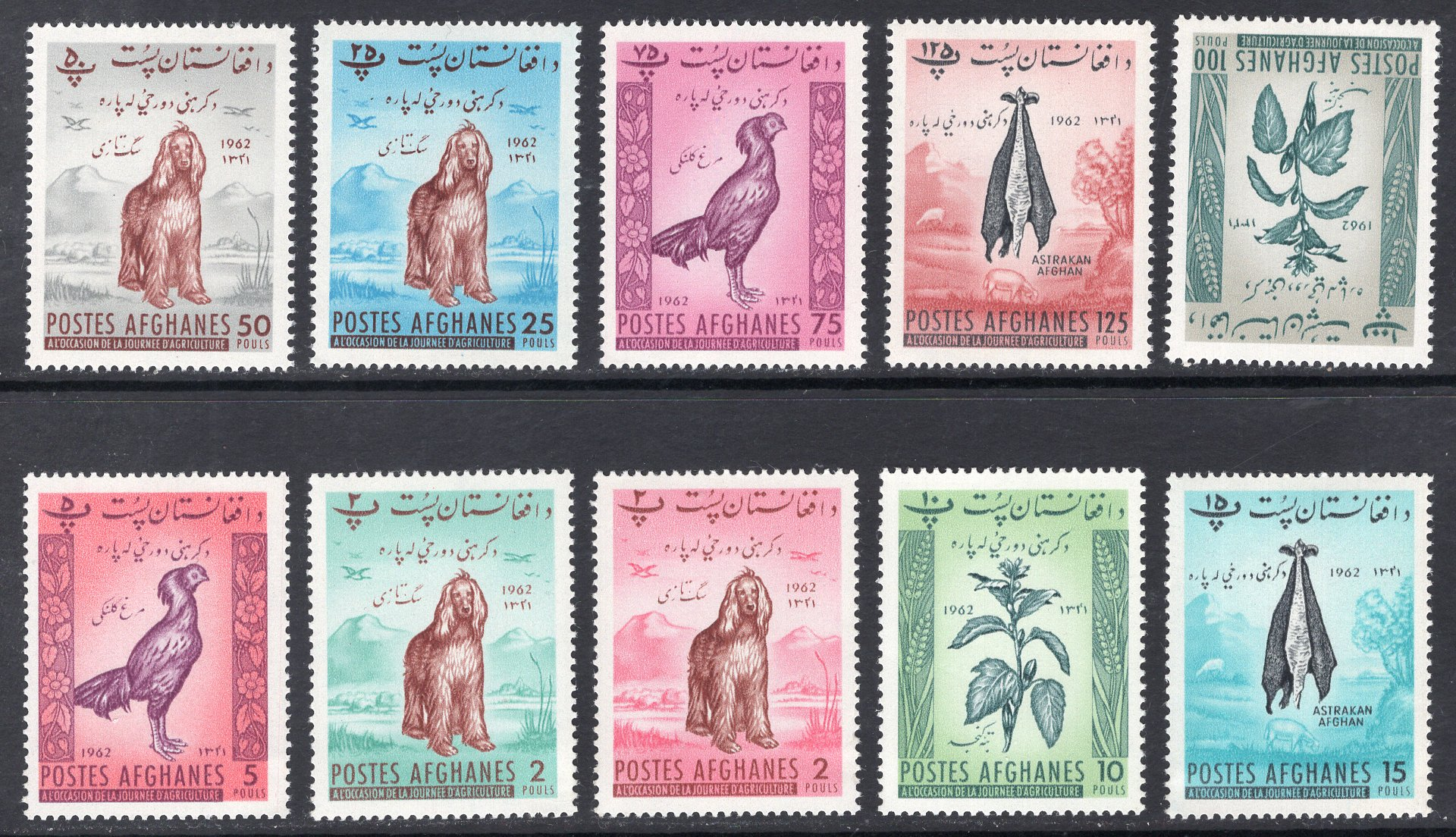 Afghanistan Scott 565-574. Complete set. Mint. Never hinged. Very very trivial disturbed gum.