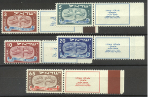 Scott #10-14: 1948 Flying Scroll Set Centering & Condition: Mint. Fresh. Fine-Very Fine set of Tab singles. Reverse (Gum Side): Original gum. Never Hinged. Faults / Imperfections: None The item pictured is the actual item you are purchasing, unless otherwise noted. I also offer an interest-free layaway plan. Ask me about it!" All items will be mailed a day or two after payment is received. --------------------------------------------------------------------------------