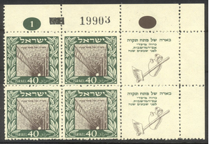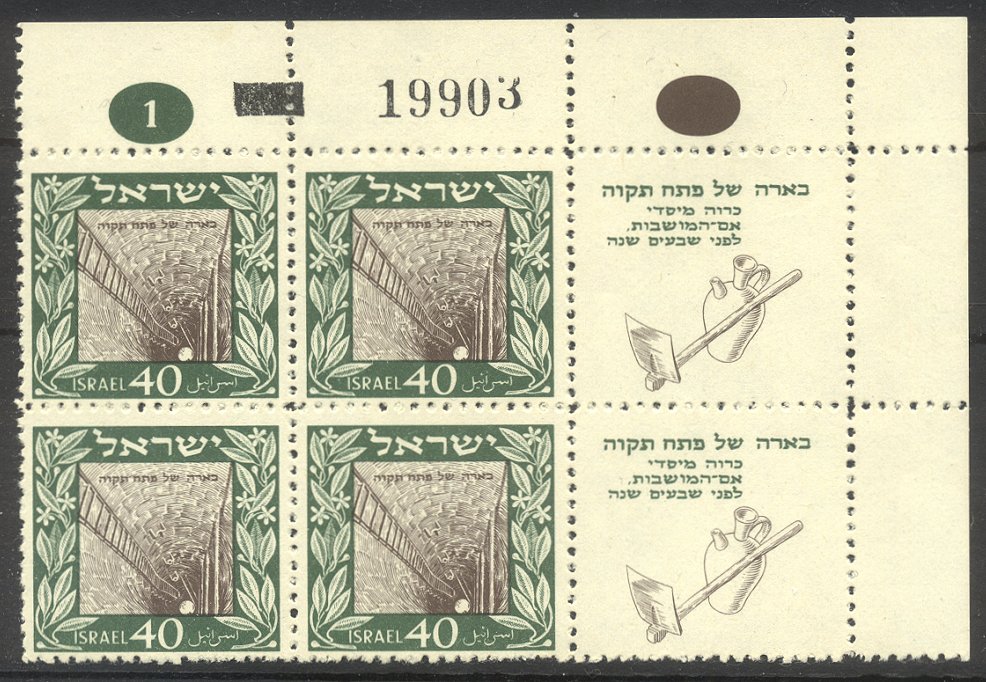 Scott #27: 1959 40p Petah Tikva Centering & Condition: Mint. Fresh. Fine-Very Fine Tab Plate Block. Reverse (Gum Side): Original gum. Never Hinged. Faults / Imperfections: None The item pictured is the actual item you are purchasing, unless otherwise noted. I also offer an interest-free layaway plan. Ask me about it!" All items will be mailed a day or two after payment is received. ![]() ![]() ![]() --------------------------------------------------------------------------------