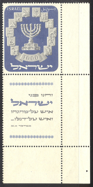Scott #55: 1952 1000p Menorah Centering & Condition: Mint. Fresh. Very Fine with Tabs.. Reverse (Gum Side): Original gum. Never Hinged. Faults / Imperfections: None The item pictured is the actual item you are purchasing, unless otherwise noted. I also offer an interest-free layaway plan. Ask me about it!" All items will be mailed a day or two after payment is received. ![]() ![]() ![]() --------------------------------------------------------------------------------