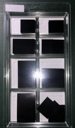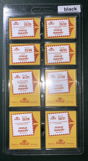 This pack includes 8 of the most popular pre-cut sizes of Prinz Stamp Mounts. There are 40 pieces per size for a total of 320 mounts. The package is designed to be used as a refillable storage tray to keep your mounts organized.