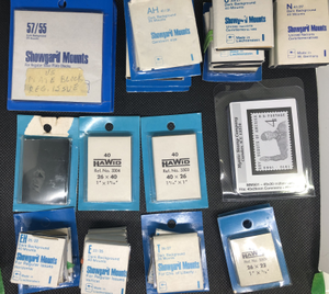 30 packages of Showgard, Hawid, and 1 Mystic pre-cut black mounts. Some of them have been opened and partially used many have not. These are pre-owned but appear to be in good condition. Please see the photos.