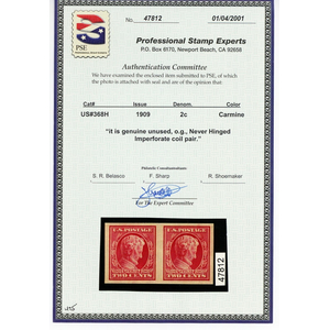 368H, Mint NH XF 2¢ Imperforate Coil Pair With PSE Certificate * Stuart Katz