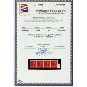 368H, Mint NH VF 2¢ Imperforate Coil Strip of Four PSE Certificate * Stuart Katz