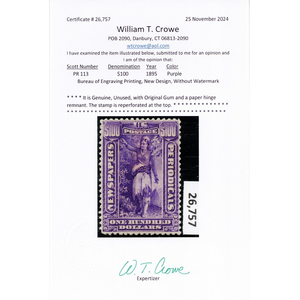PR113, Mint HR RARE $100 Newspaper Stamp With Crowe Cert Cat $3500 - Stuart Katz