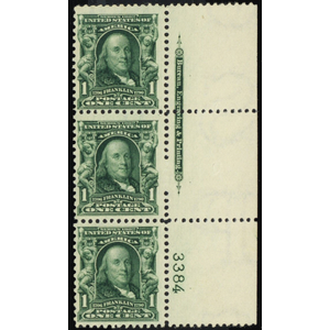300, Mint NH 1¢ PL# & Imprint Strip of 3 Stamps * Stuart Katz