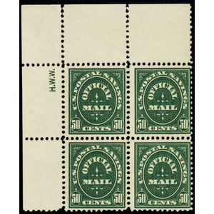 O122, Mint NH 50¢ Official Block Sideographers Initials EXT RARE! - Stuart Katz