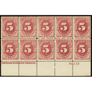 J25, Mint VF OG NH 5¢ Scarce Plate Block of Ten Stamps CV $1450.00 - Stuart Katz