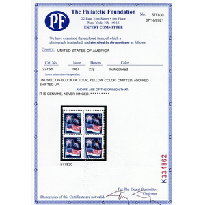 2276a, Mint 22¢ VF NH Yellow Color Omitted With PFC Cert - Stuart Katz