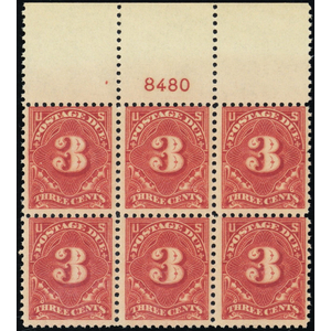 J63, Mint NH 3¢ Top Plate Block of Six SCV $275 * Stuart Katz