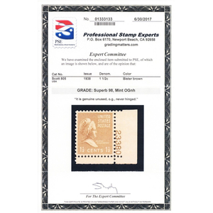 805, Mint NH 1 1/2¢ Superb - With Graded 98 PSE Certificate - Stuart Katz