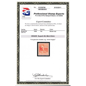 815, Mint NH 10¢ Superb - With Graded 98 PSE Certificate - Stuart Katz